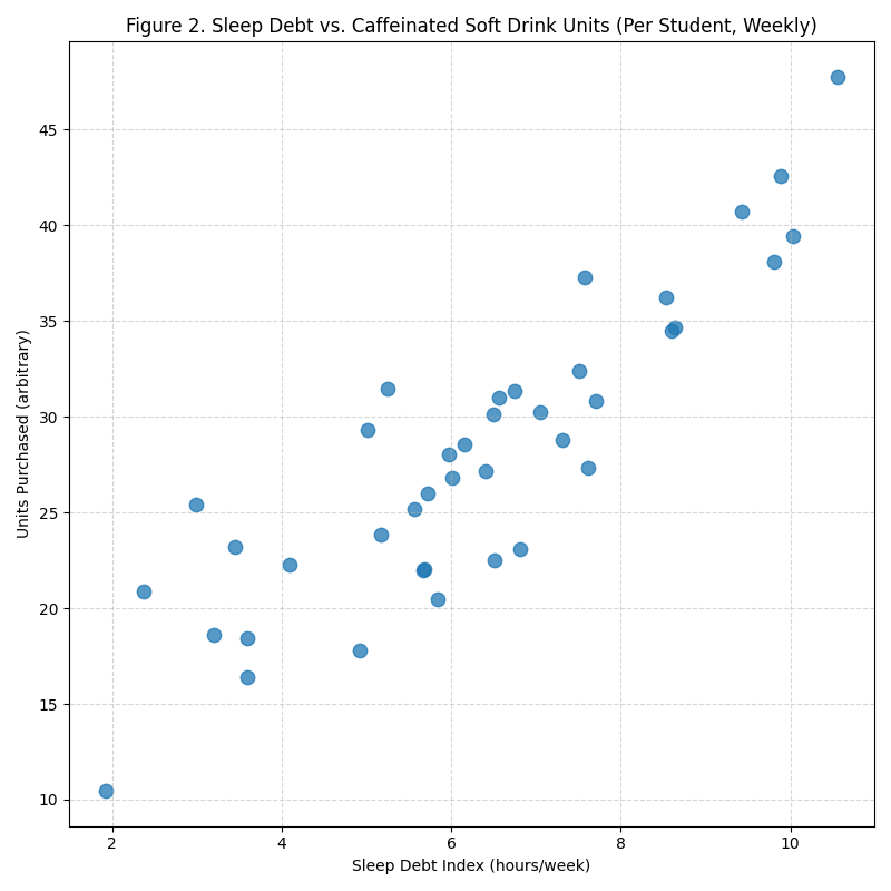 We next examined whether schedule-induced sleep debt could predict per-student caffeinated soft drink units. Using a simple simulated student panel (a respectable technique when you do not have access to real data and refuse to let that stop you), we found a strong positive relationship between weekly sleep debt and beverage units purchased.