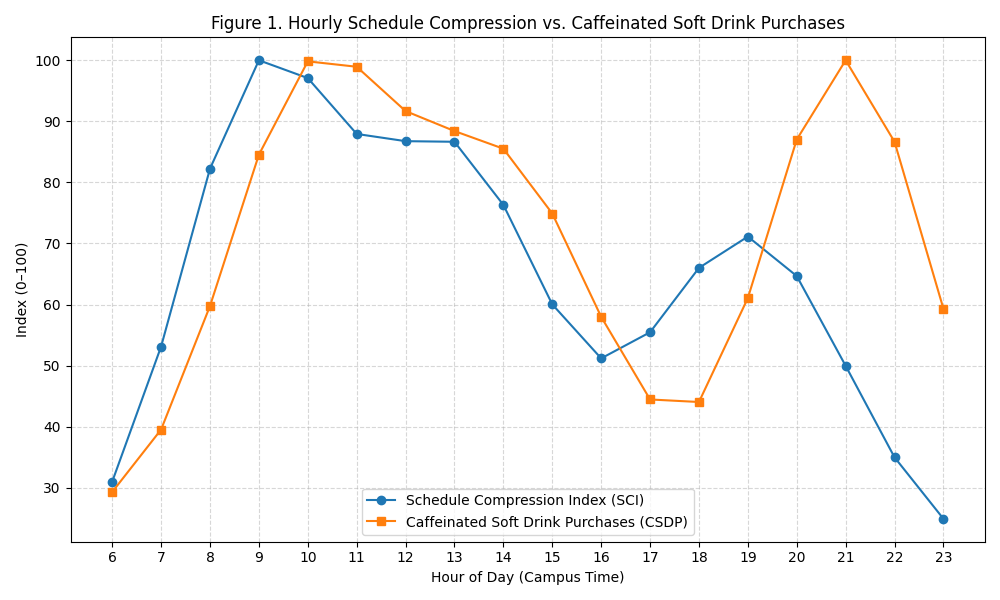 Figure 1. Hourly Schedule Compression Index (SCI) vs. Caffeinated Soft Drink Purchases (CSDP). Note the repeated co-peaks and the late-evening “panic bump.”